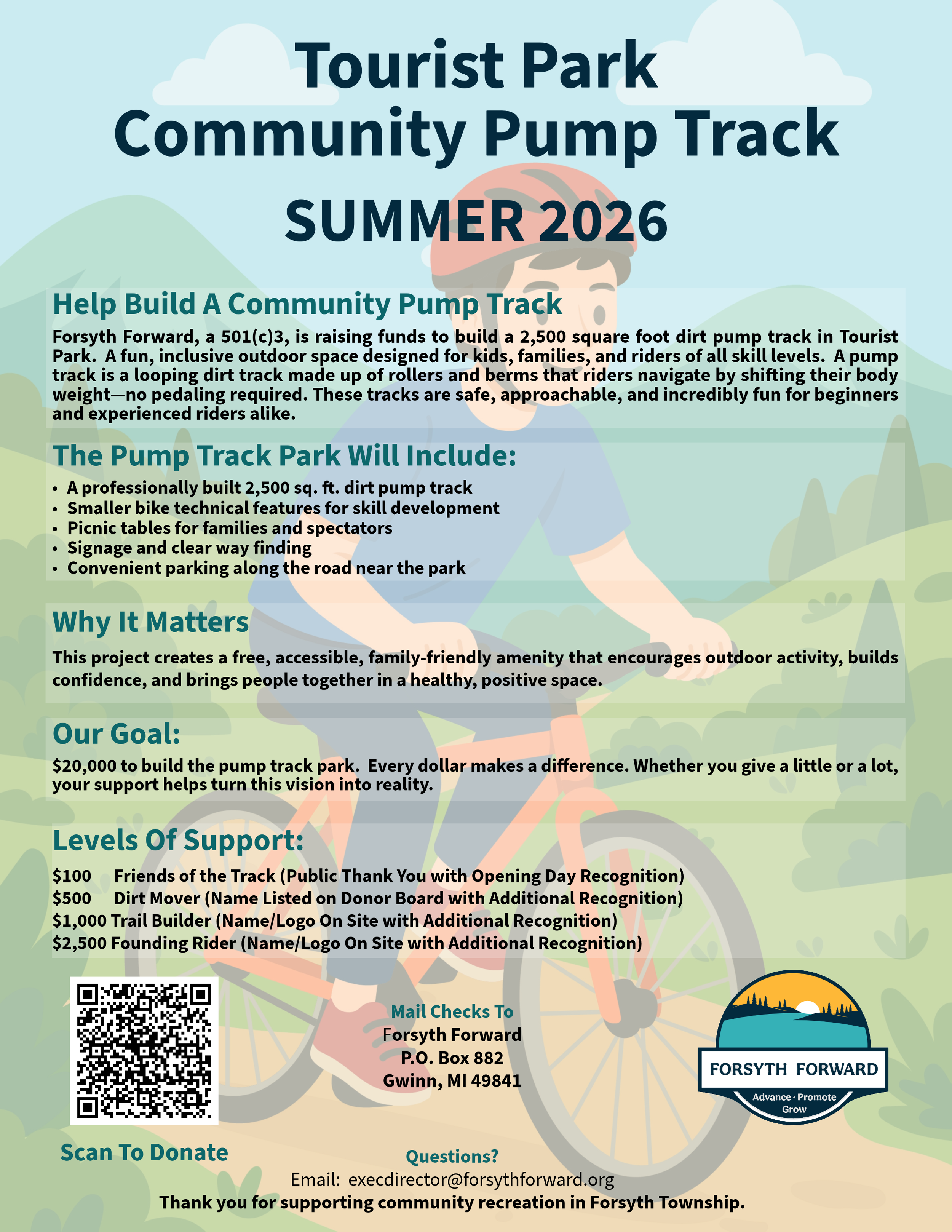 Your Donation of any amount goes directly to this project. The pump track creates a critical amenity for families in Forsyth Township.